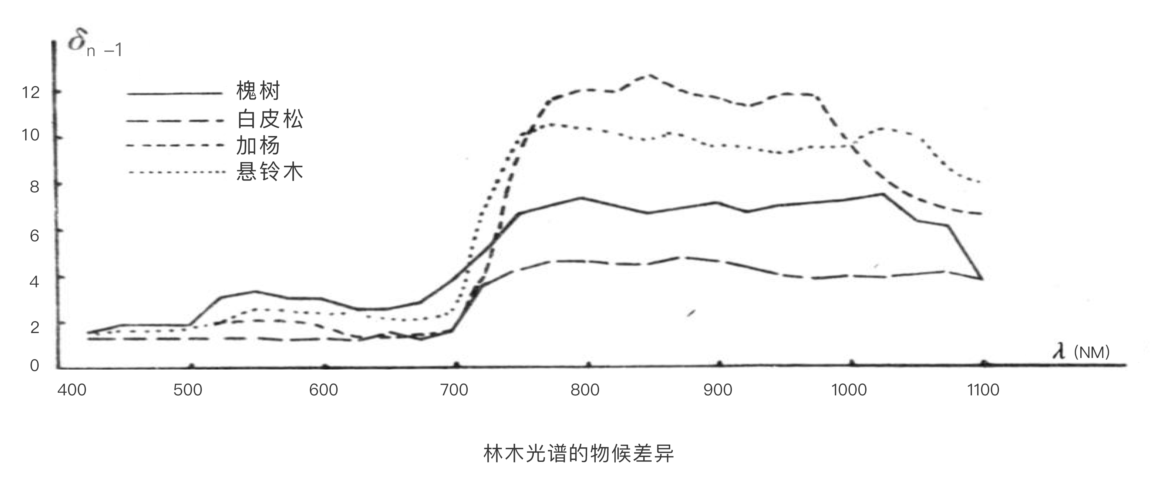 在电磁波谱范围内,林木的光谱响应主要集中在0.4~2.6微米的波段,这是林业遥感中常用的光谱范围。除了该波段之外,林木在8~14微米的热辐射特性,以及其他波段的光谱特性,也具有重要的应用潜力。林木在不同波段的反射、透射和吸收率因树种、树叶生理状态和生长环境等因素而不同,提供了丰富的信息用于遥感数据的解译。